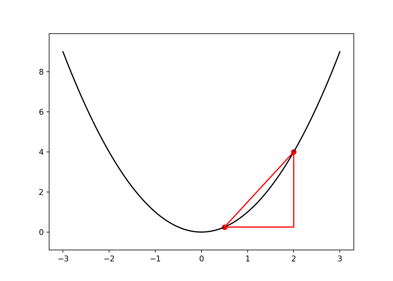For å finne en tangent trenger vi kun to ting: punktet der tangenten treffer kurven samt stigningstallet. Tangeringspunktet er lett å finne, vi kan nemlig bare evaluere funksjonen. Vi velger å kalle interessepunktet for \[ (x_1, y_1) \] Og \[ f(x_1) = y_1\] Dessverre er stigningstallet mye vanskeligere å finne, men vi kan prøve noe omtrentlig, og se hvor langt vi kommer. I steden for å lage en tangent, kan vi heller lage en korde: en linje som skjærer funksjonen på to steder. Med to punkter kan vi lett finne linjen som går gjennom. Gitt to punkter \[ (x_1, y_1)\\ (x_2, y_2) \] Kan vi vinne stigningstallet, \(a\), med denne enkle formlen: \[ a = \frac{y_2 - y_1}{x_2-x_1} = \frac{\Delta y}{\Delta x}\] ‘\(\Delta\)’ er den gammelgreske bokstaven for ‘d’ og i matematikken symboliserer differansen mellom de to punktene i henholdsvis y-retning og x-retning. Geometrisk kan dette tolkes som forholdet mellom høyden og bredden til trekanten som dannes av de to punktene: