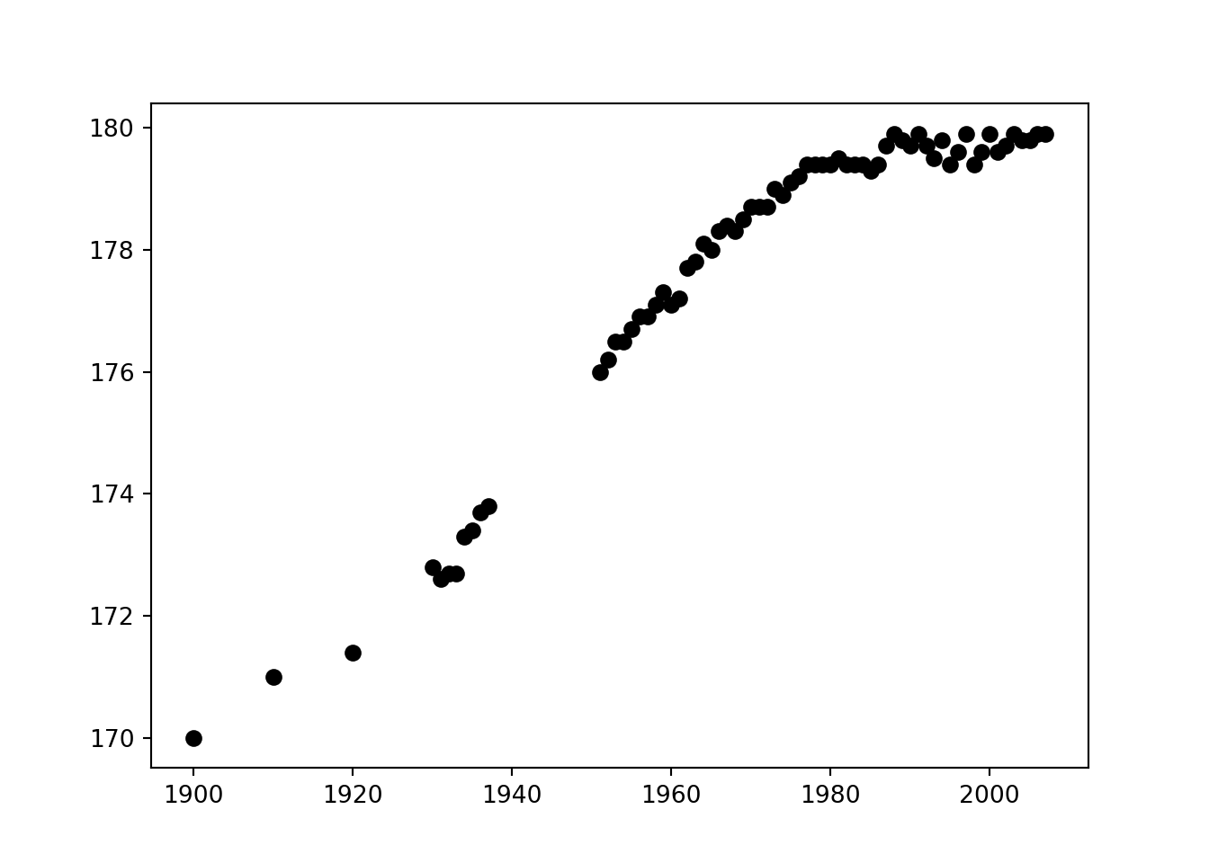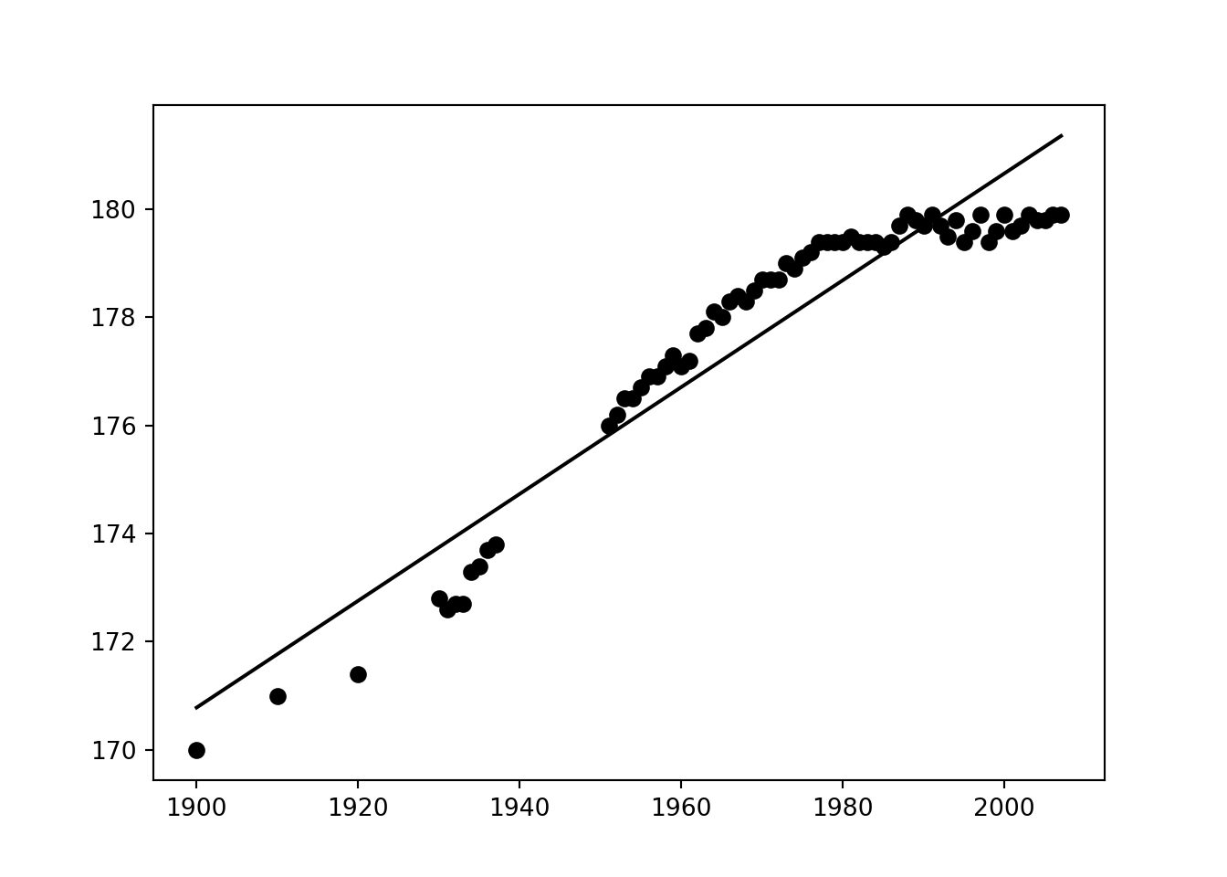 Vi ser at linjen passer nokså godt, men det virker ikke som om relasjonen vi leter etter er lineær. Det er flere grunner til å betvile denne antaglesen før vi i det hele tatt ser på dataen. For det første vil en lineær trend på et tidspunkt krysse null, men å tillate at snitthøyden er null er absurd. En lineær trend vil også antyde at vi kan vokse grenseløst høye, som også er lite trolig, dog ikke like absurd. Mer konkret kan vi tolke parameterne \(a\) og \(b\), og de sier at i år 0 var snitthøyden minus 16 centimeter og at snitthøyden vokser med én millimeter per år.