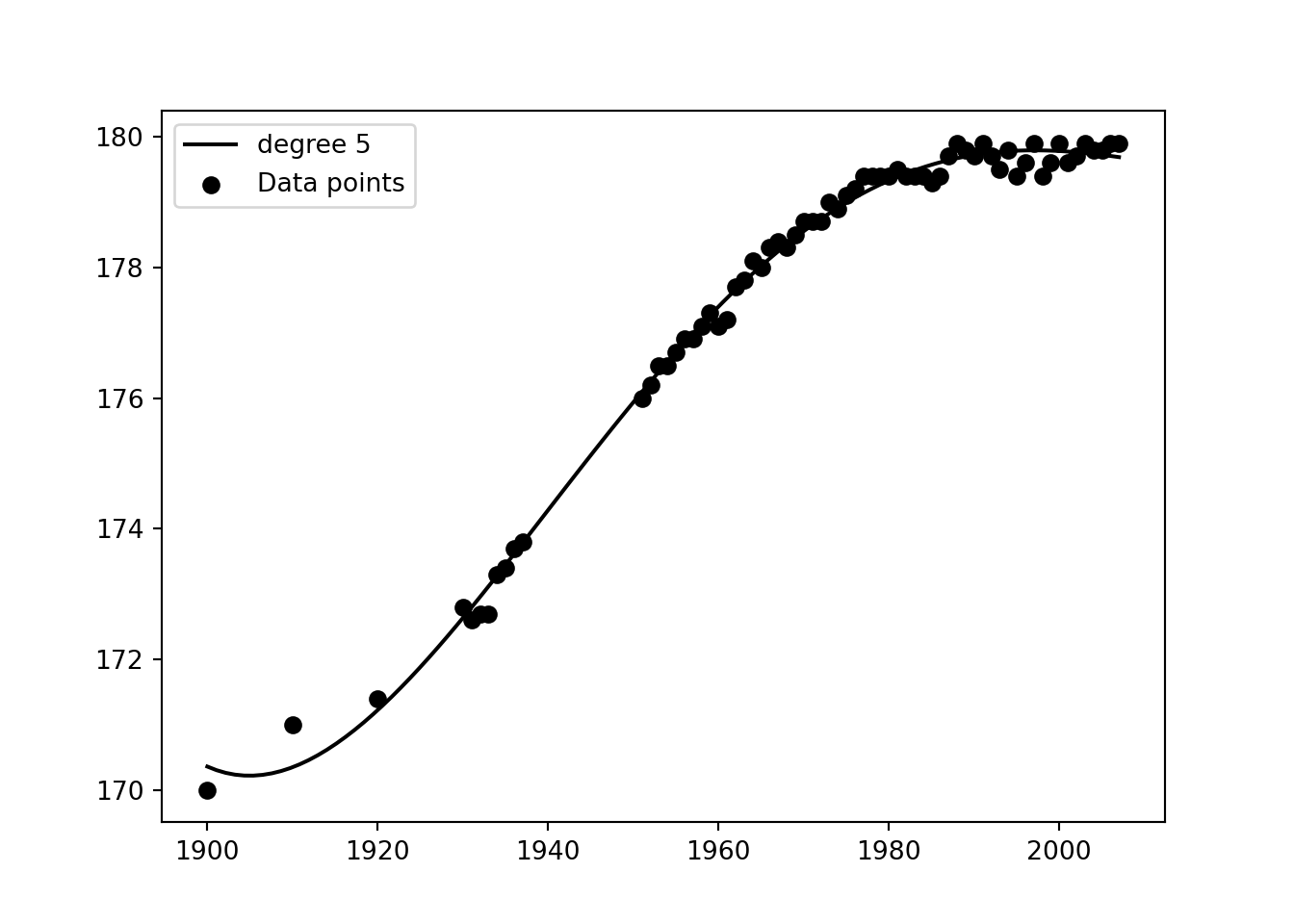 Vi kan prøve å tilpasse et polynom, det er en funksjon av n-te grad. Etter litt prøving og feiling ser det ut som en femtegradsfunksjon passer fint. Derimot kan vi i mye mindre grad tolke funksjonen utenfor datapunktene (dette kalles ekstrapolering)