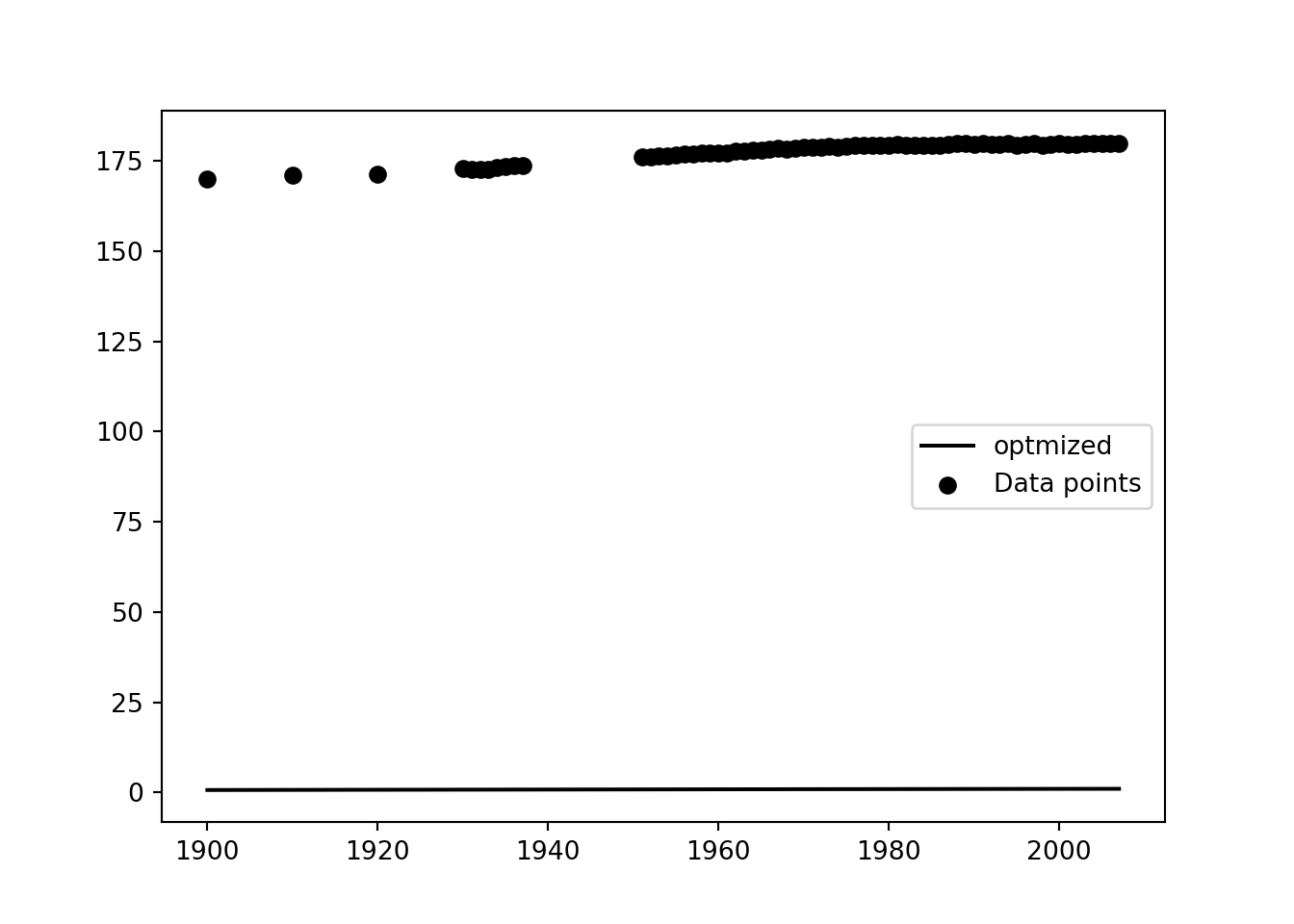 print(f'Predikert høyde i år 0: {int(model.predict( np.array([0]).reshape(1,-1))[0])} cm')