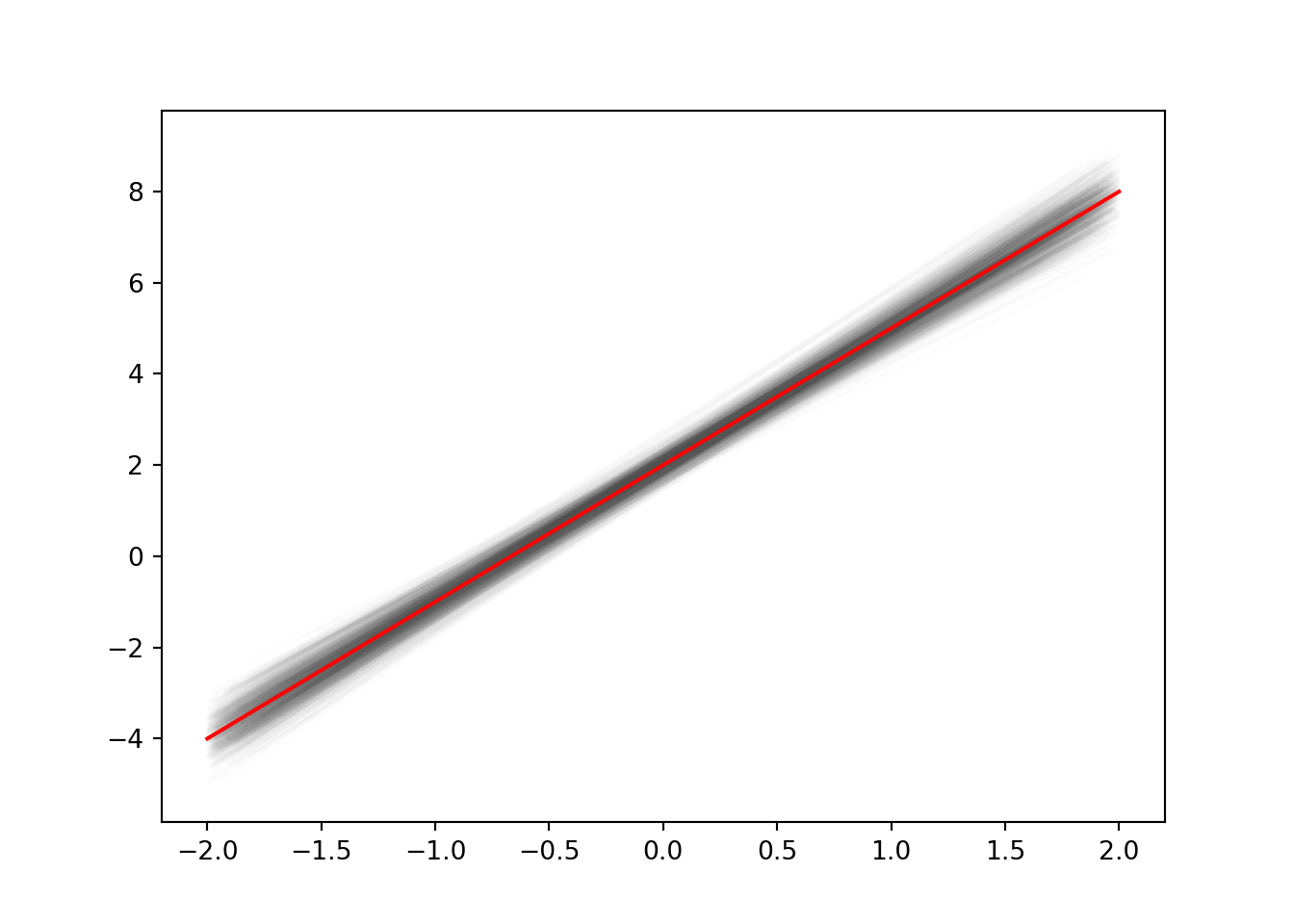 \[ f(x) = 2 + 3x + \epsilon \] Der \(\epsilon\) er et normalfordelt støyledd med gjennomsnitt \(\mu = 0\) og standardavvik \(\sigma = 1\).
